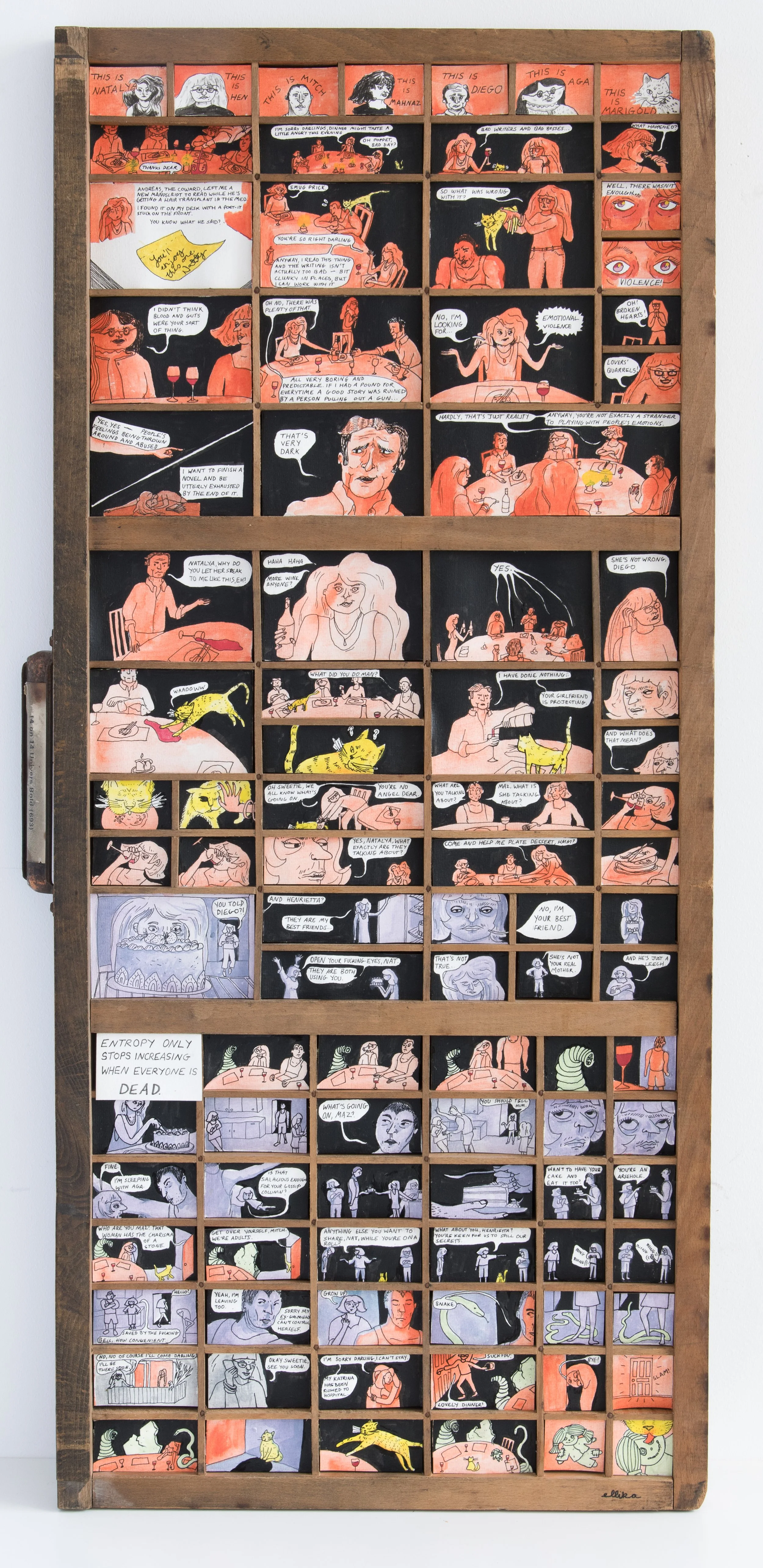 Displayed in a printer's tray and therefore dictated by a preordained structure and sequence of panels (an isolated system), the comic is a story told in three acts: